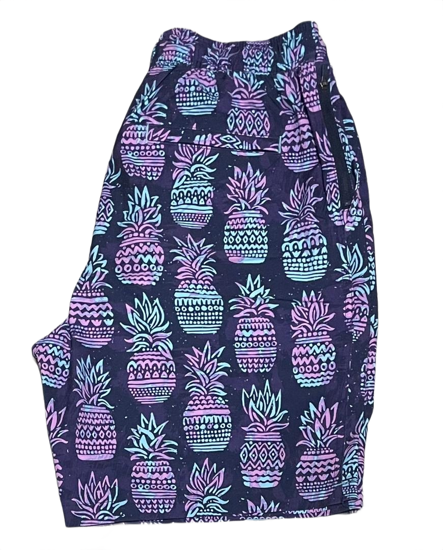 Bring a tropical vibe to the pool with these neon pineapple print swim shorts. Featuring an all-over geometric pineapple pattern in vibrant purple and teal gradients, these shorts stand out against a classic navy base. Crafted from lightweight, quick-dry fabric with an adjustable waistband, they offer both bold style and essential comfort for your next getaway.