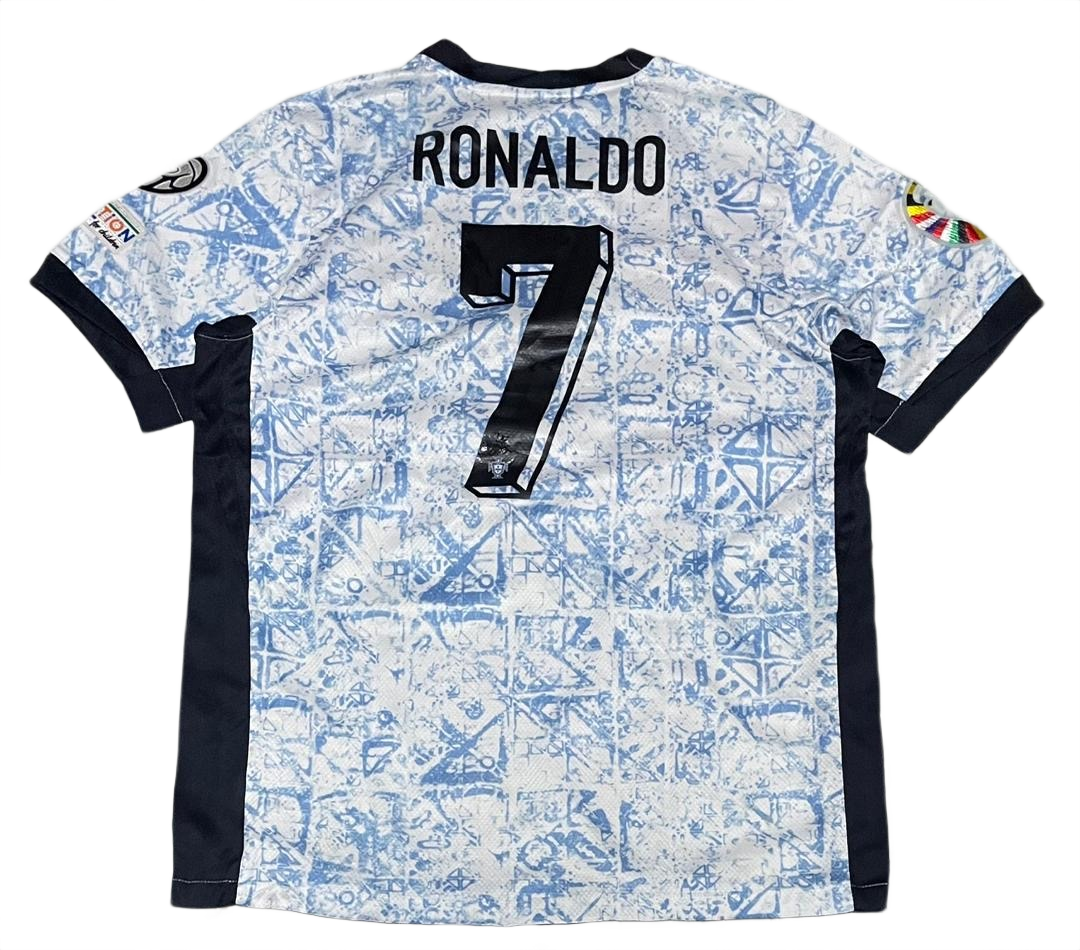 Celebrate Portuguese heritage with the Euro 2024 Away Jersey. This kit features a striking "Azulejo" tile-inspired graphic print in light blue against a sail-white base. Engineered with high-performance moisture-wicking fabric, it includes the iconic number 7 and official UEFA Foundation sleeve patches, blending national pride with professional-grade comfort.