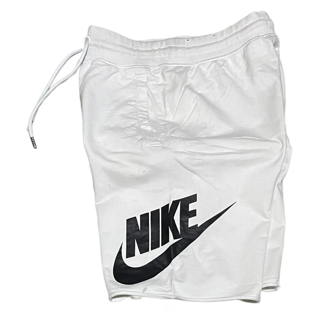 Stay comfortable and stylish with these essential Nike jersey shorts. Featuring a clean white base and a bold, oversized Nike swoosh logo on the left leg, these shorts are perfect for both active sessions and casual daily wear. The adjustable drawstring waist and breathable cotton fabric ensure a secure, comfortable fit for all-day use.