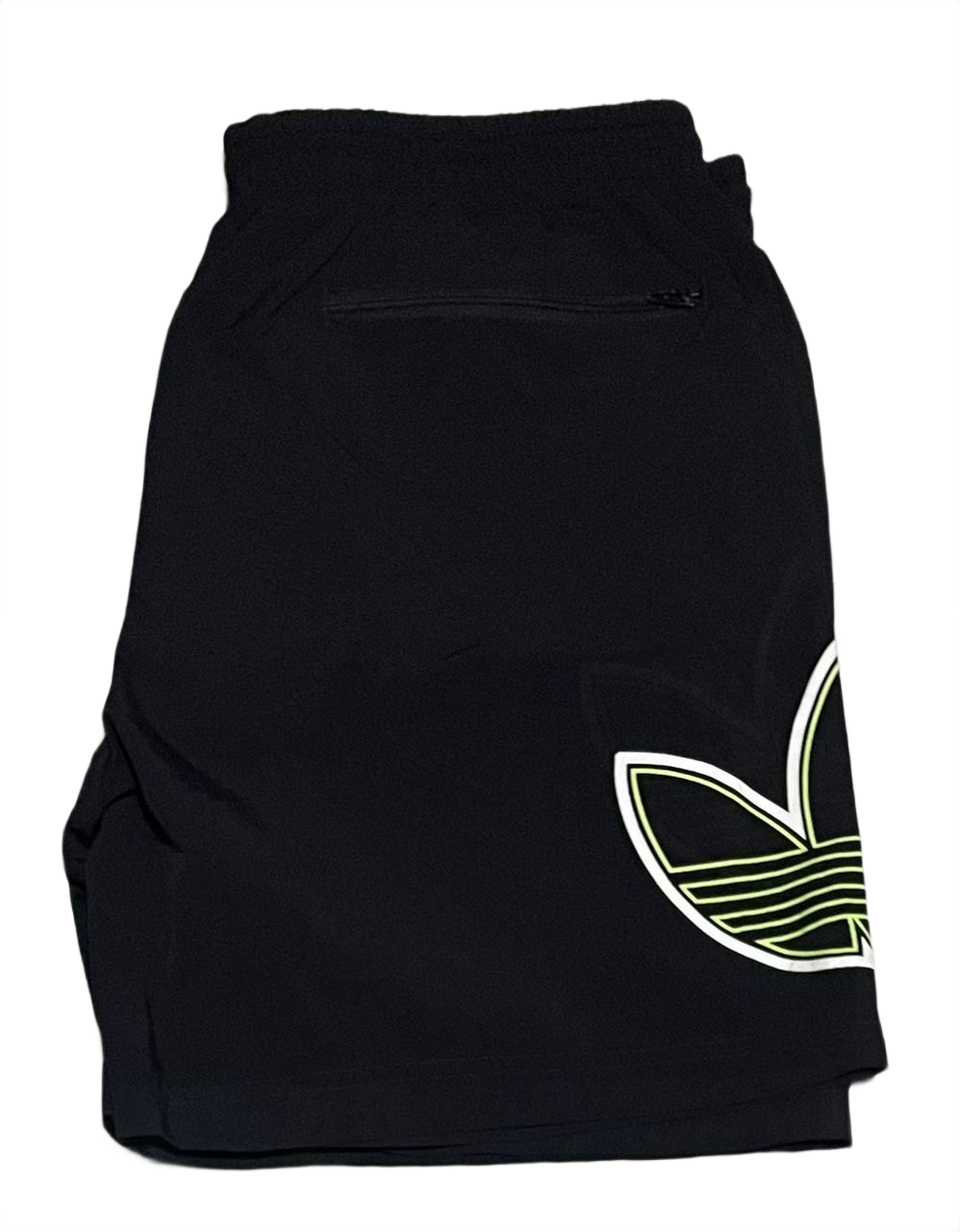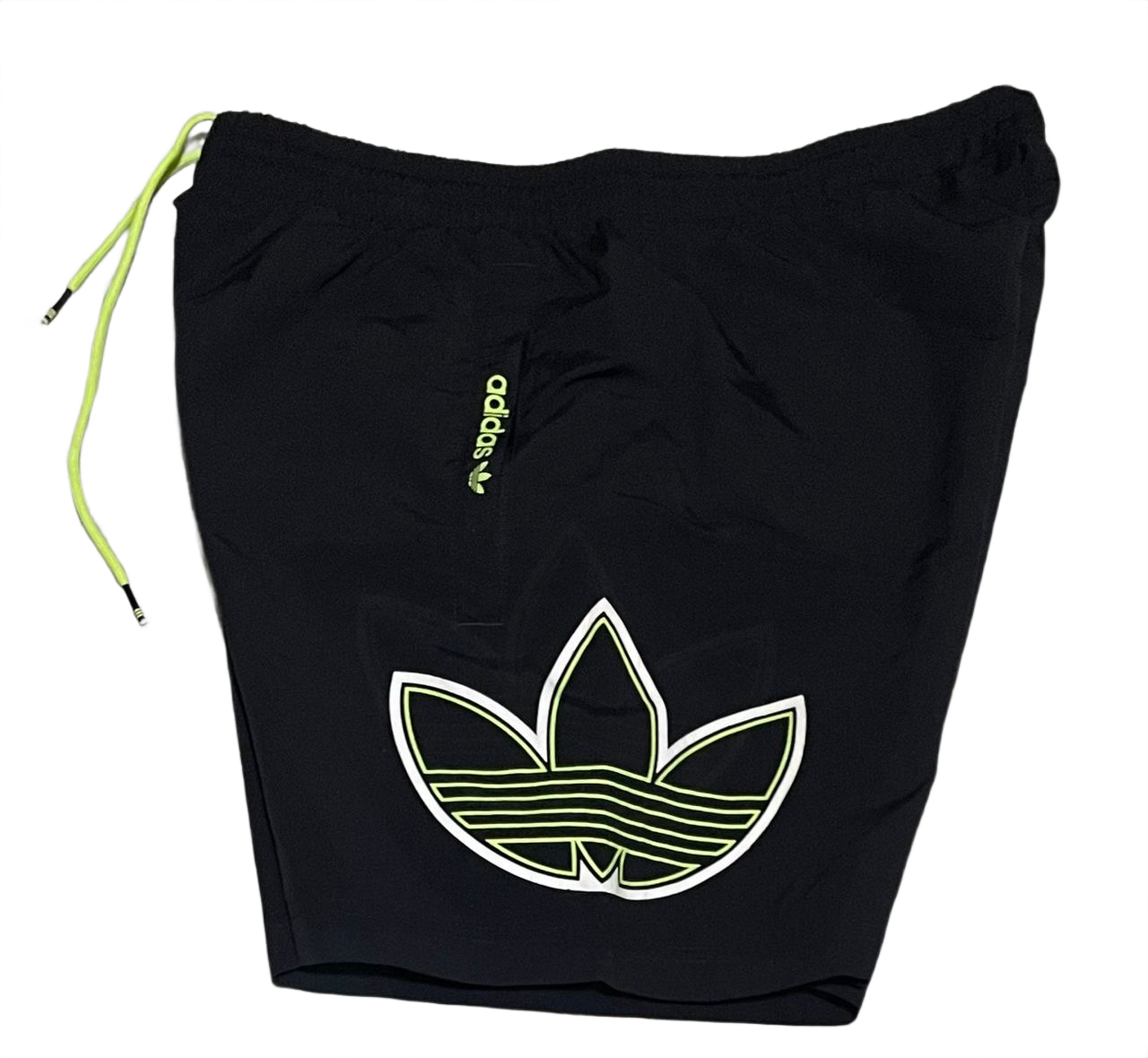 Style meets heritage in these bold Adidas Originals swim shorts. Featuring an oversized Trefoil logo outlined in vibrant neon yellow, these shorts are made from lightweight, durable nylon for quick-drying performance. The contrasting neon drawstring and vertical branding on the pocket add a modern streetwear edge, making them perfect for the beach or the city.