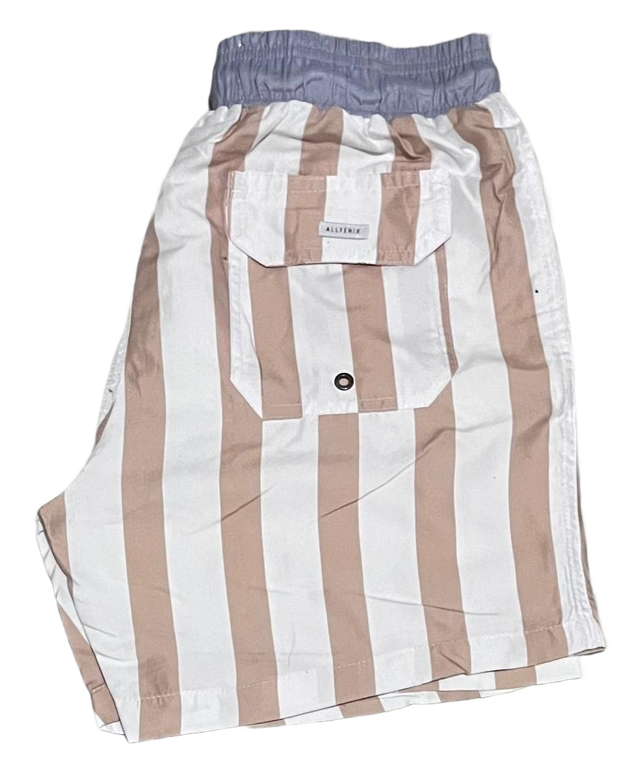 Infuse your poolside look with a classic coastal aesthetic in these vertical striped swim shorts. Featuring a sophisticated tan and white pattern paired with a contrasting light blue waistband, these shorts are crafted from lightweight, quick-dry fabric for all-day versatility. The signature "AF" woven patch at the hem provides a clean, branded finish.