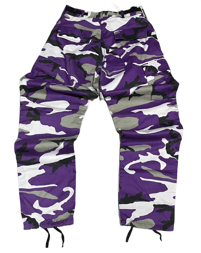 Make a bold statement with these vibrant purple camouflage cargo pants. Featuring a classic military-inspired silhouette updated with a modern, high-contrast colourway, these pants are built for both style and utility. With deep cargo pockets for extra storage and adjustable ties at the hem for a custom tapered look, they are the perfect centerpiece for any streetwear outfit.