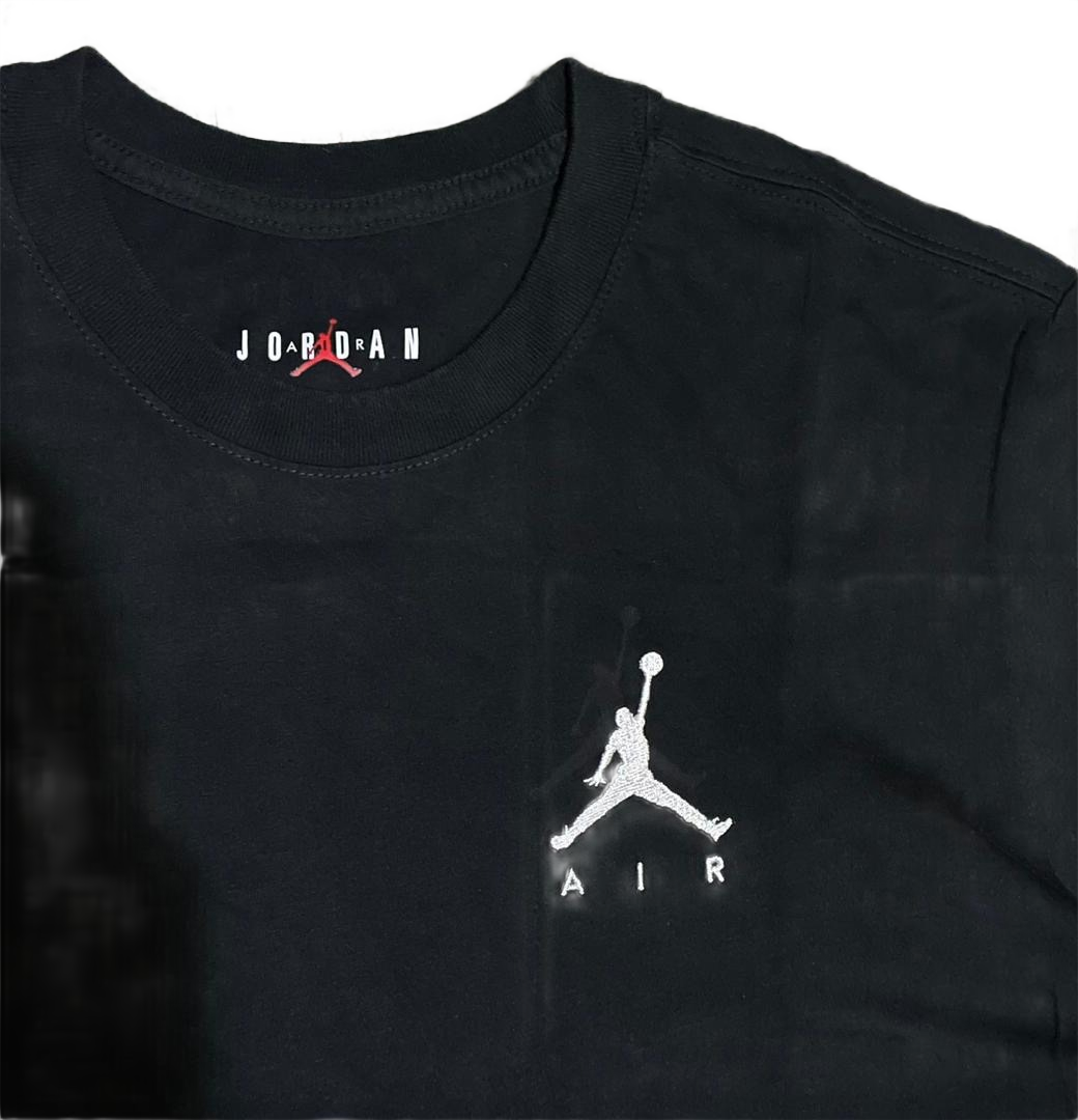 Essential black Jordan Brand t-shirt featuring the iconic white Jumpman Air logo embroidered on the chest.